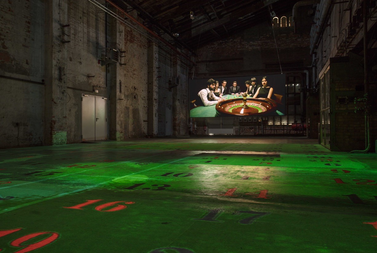 The video installation Stateless configured for the raw spaces of Kunstkraftwerk Leipzig, a reconverted power station, consists of a panoramic screen suspended in the former boiler room.